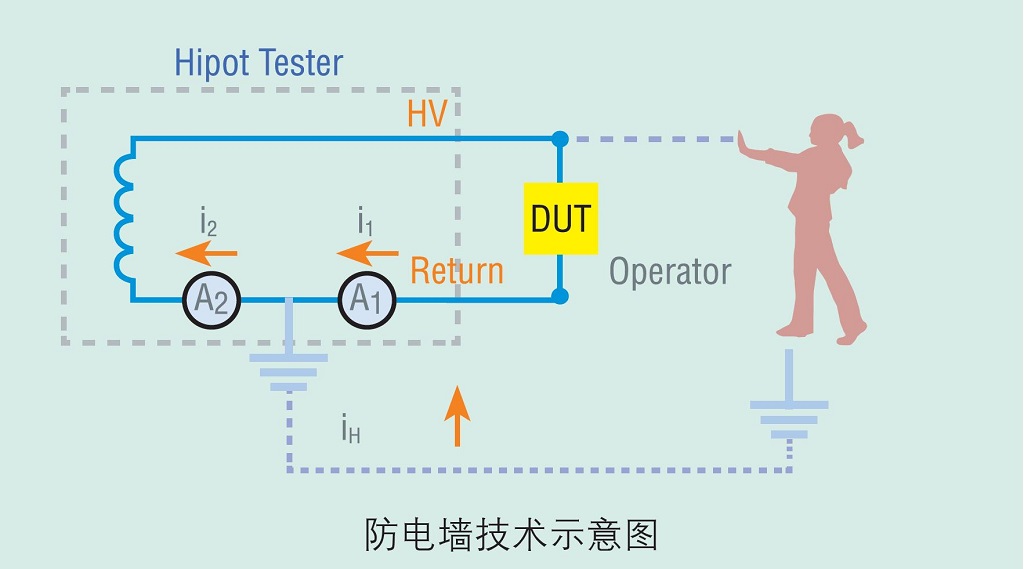 常州致新ZX9310/ZX9320系列耐壓機具有GFI防電墻功能來保護測試人員(原理如圖所示)。在突發人體感電的情形下,GFI能立即切斷儀器的電壓輸出,保護操作員不受電氣傷害。GFI功能偵測從地端(Earth GND)流回的電流iH與低端電流iL,比較后若大于0.5mA,則會立即切斷高壓輸出。