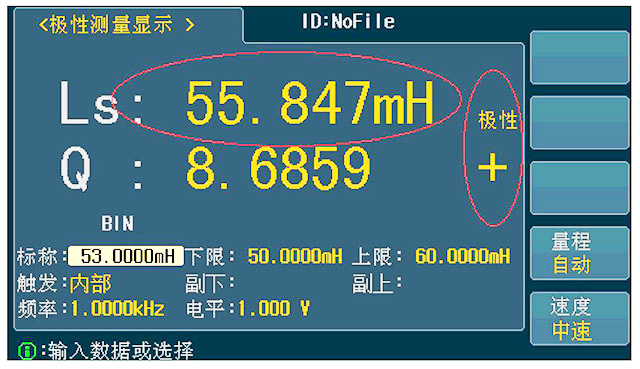 在極性測量界面,可設定:標稱值,Ls 下限值,Ls 上限值,Q 下限值,Q 上限值,